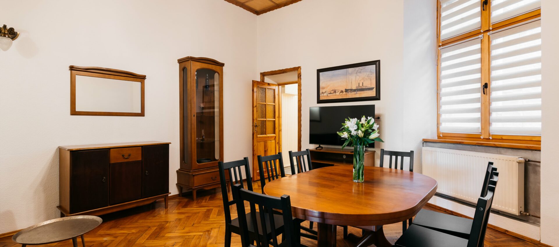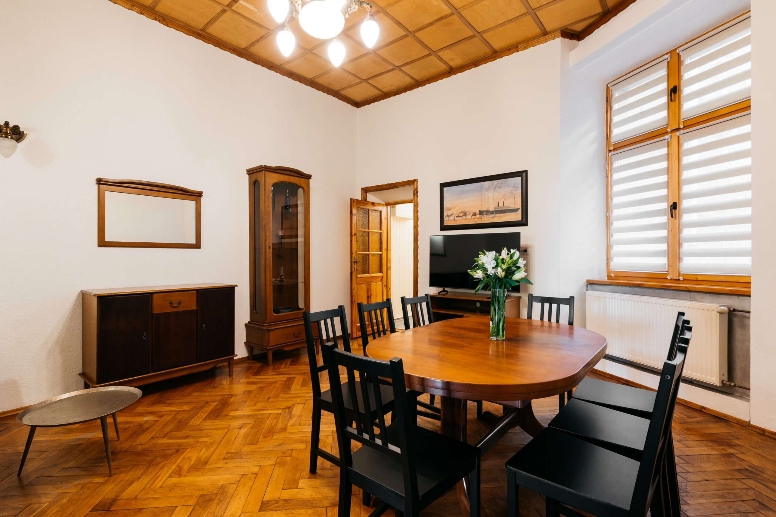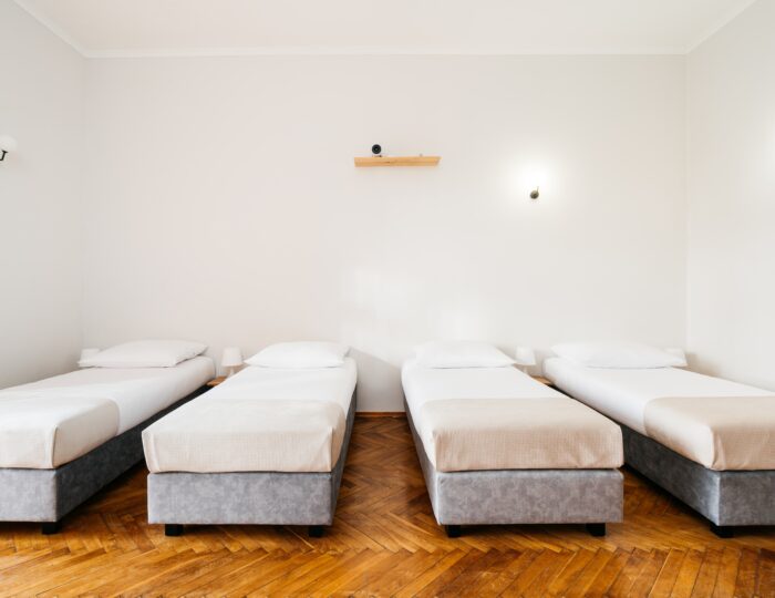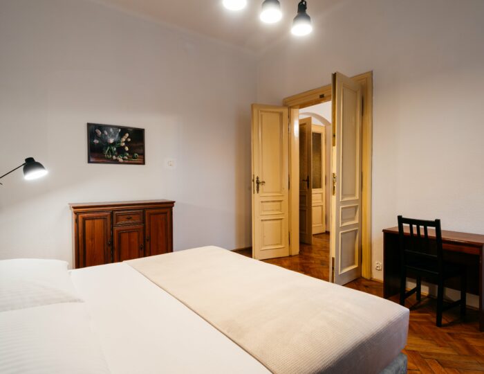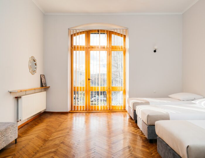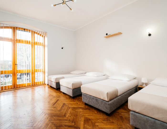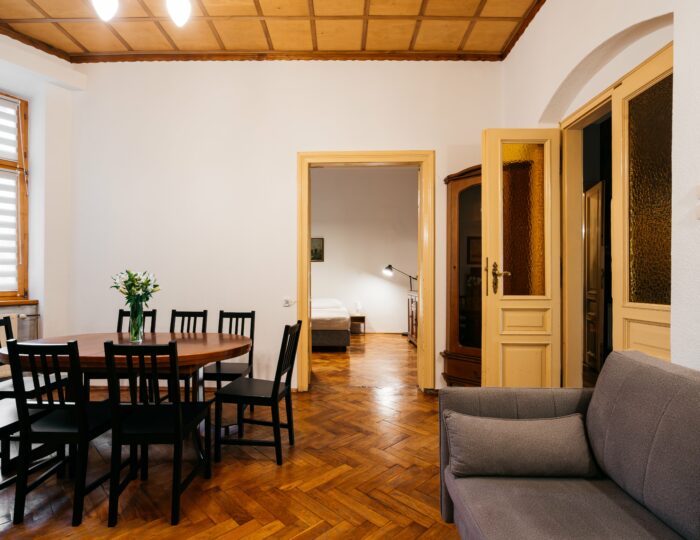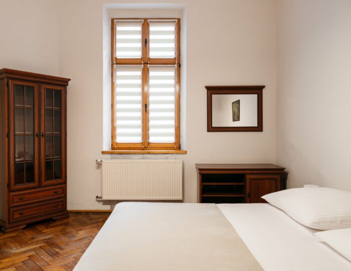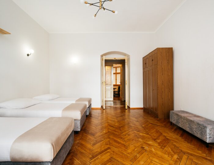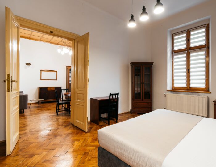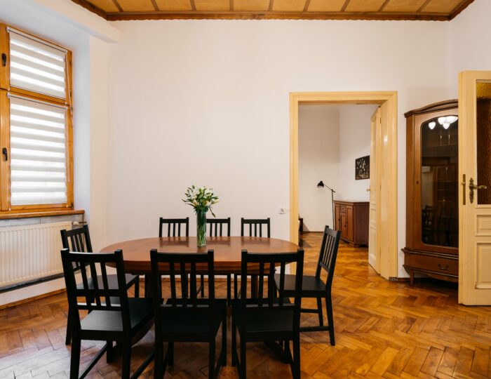 Wnętrze łączy klasyczne elementy z nutą nowoczesności – drewniane podłogi, wysokie sufity i duże okna nadają przestrzeni elegancki, krakowski charakter, a przy tym zachowują przytulny klimat sprzyjający odpoczynkowi po dniu zwiedzania.