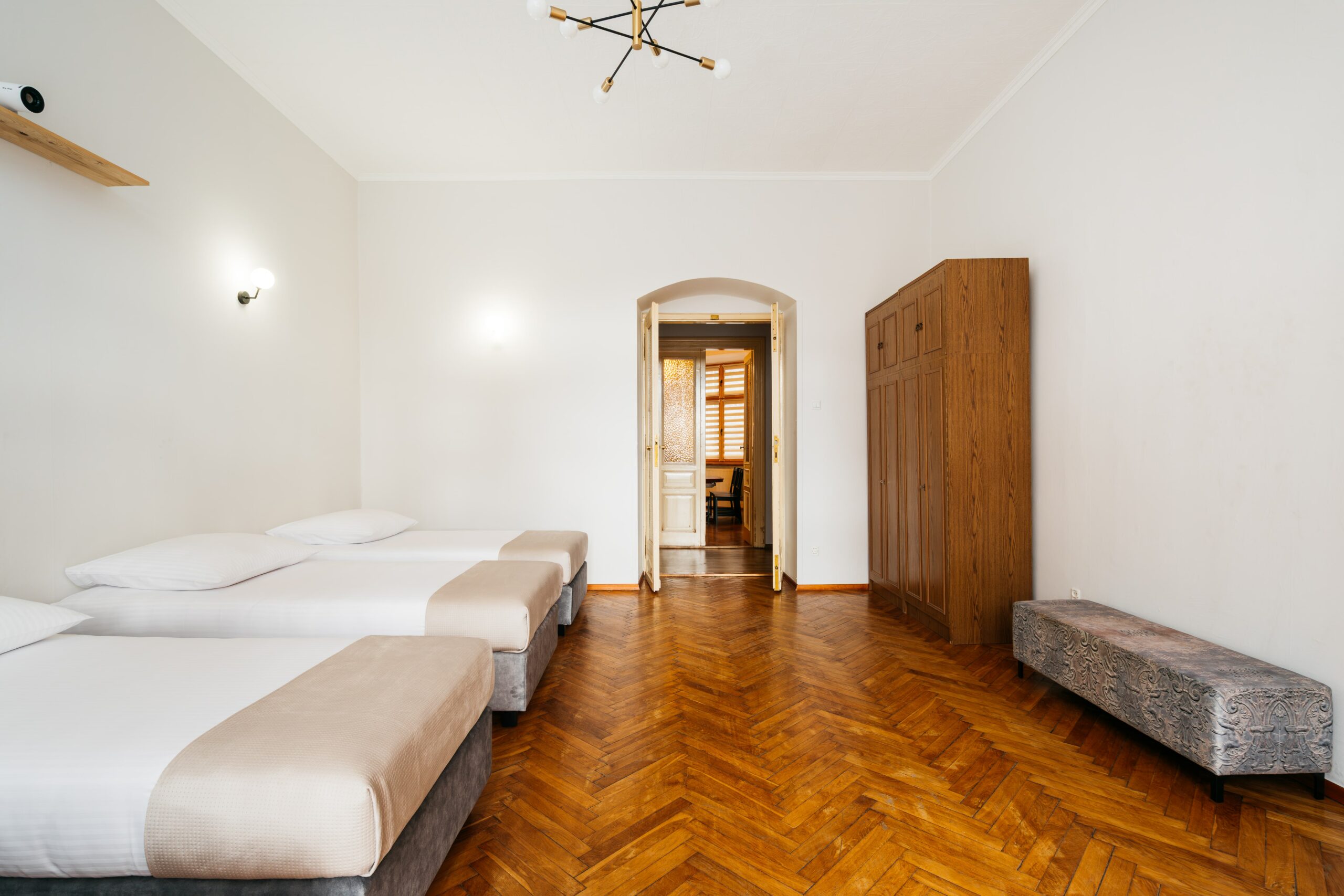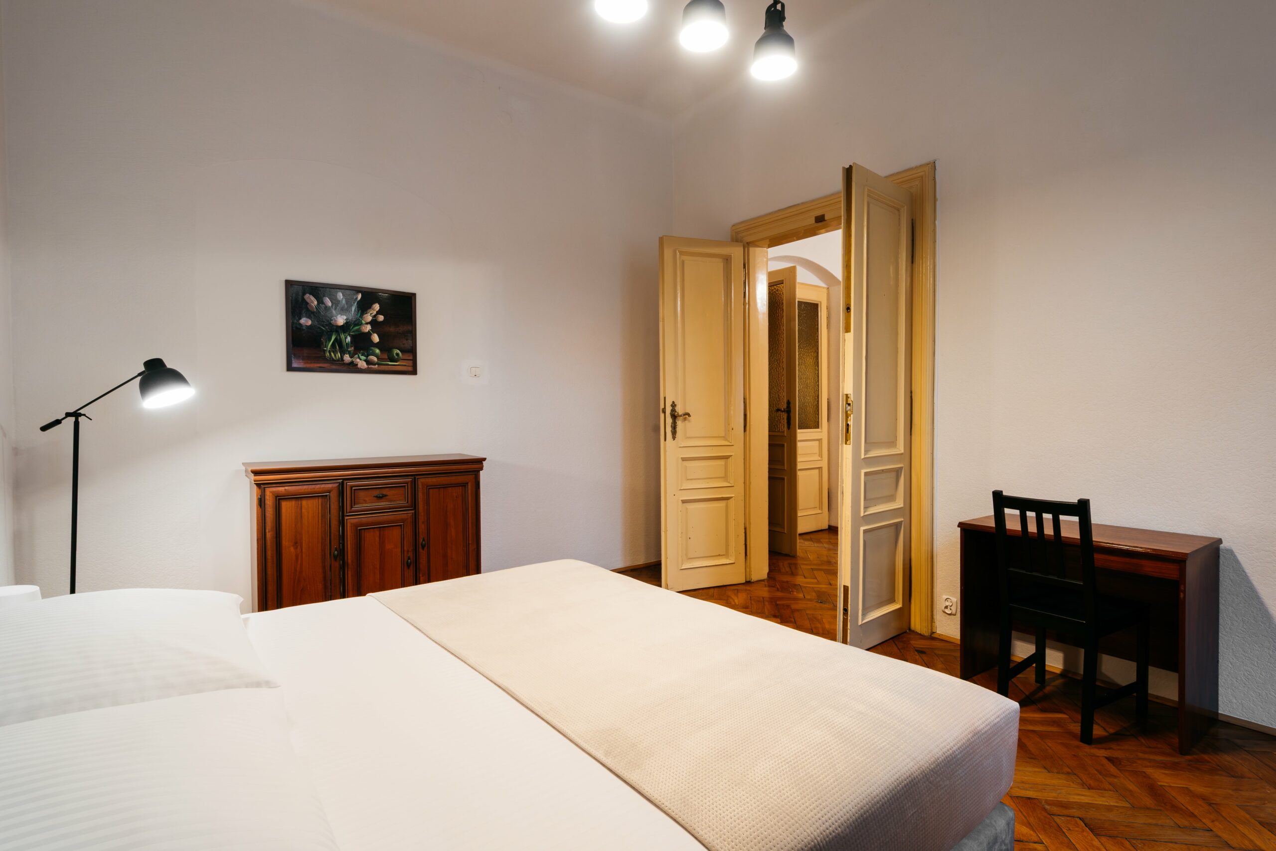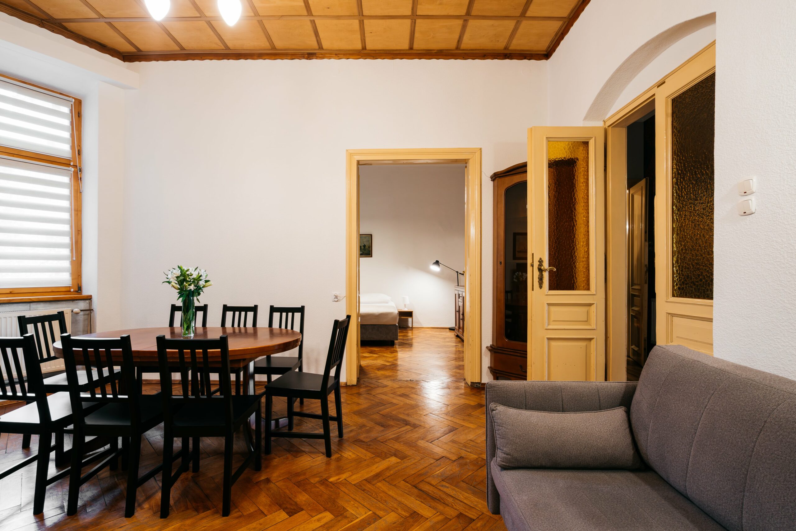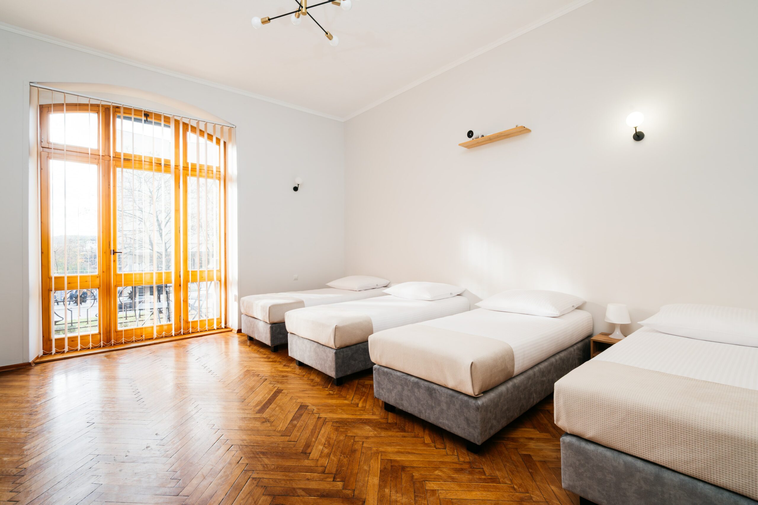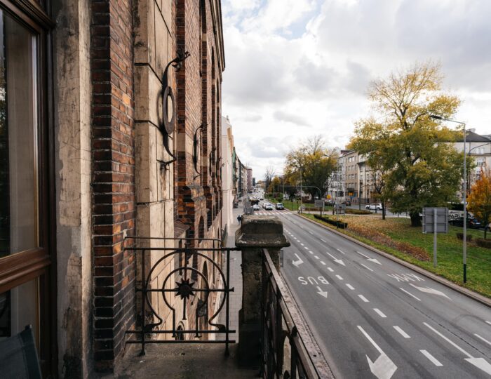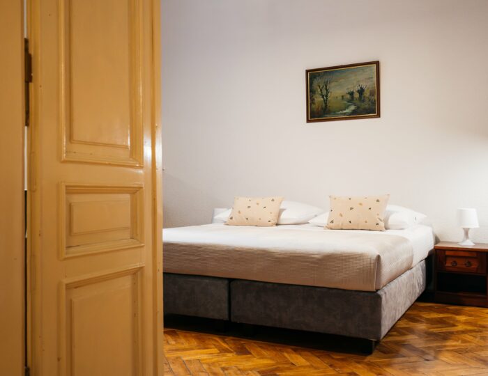 Wnętrze łączy klasyczne elementy z nutą nowoczesności – drewniane podłogi, wysokie sufity i duże okna nadają przestrzeni elegancki, krakowski charakter, a przy tym zachowują przytulny klimat sprzyjający odpoczynkowi po dniu zwiedzania.