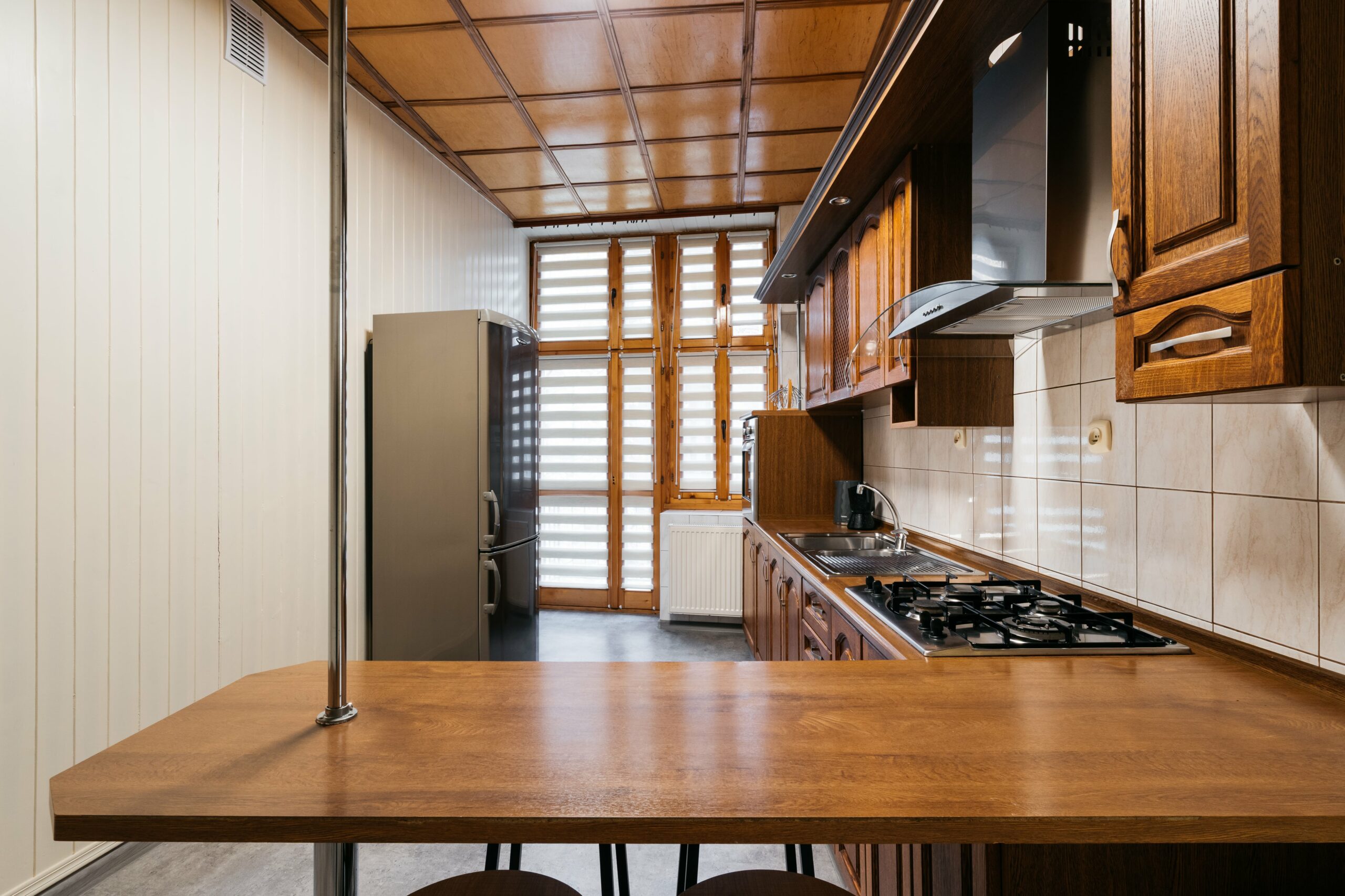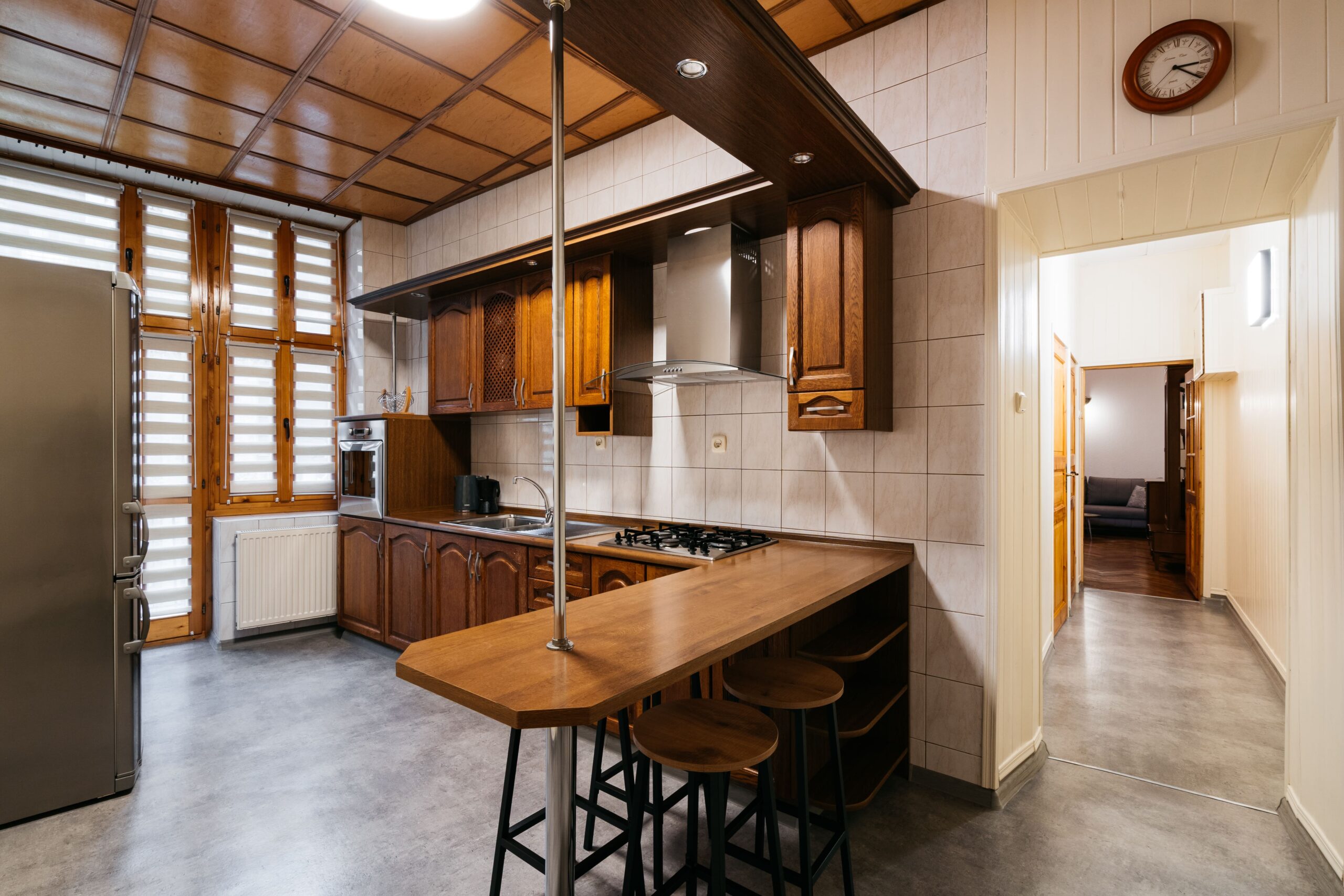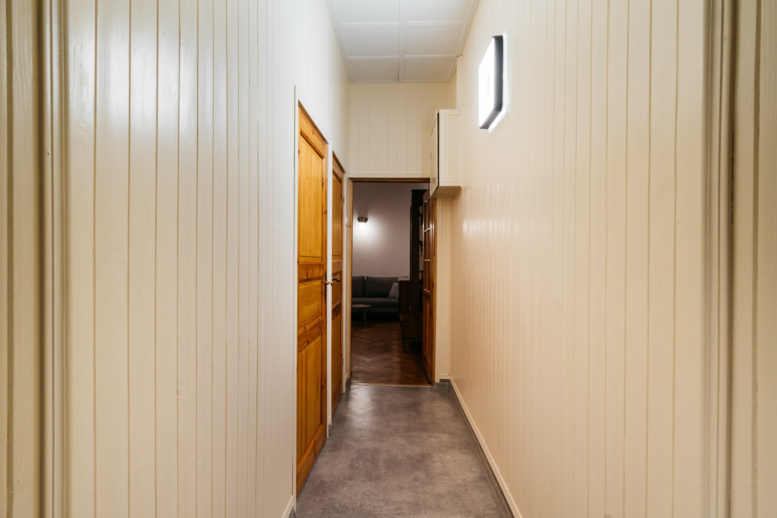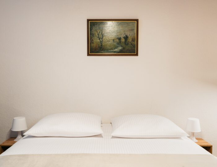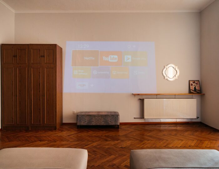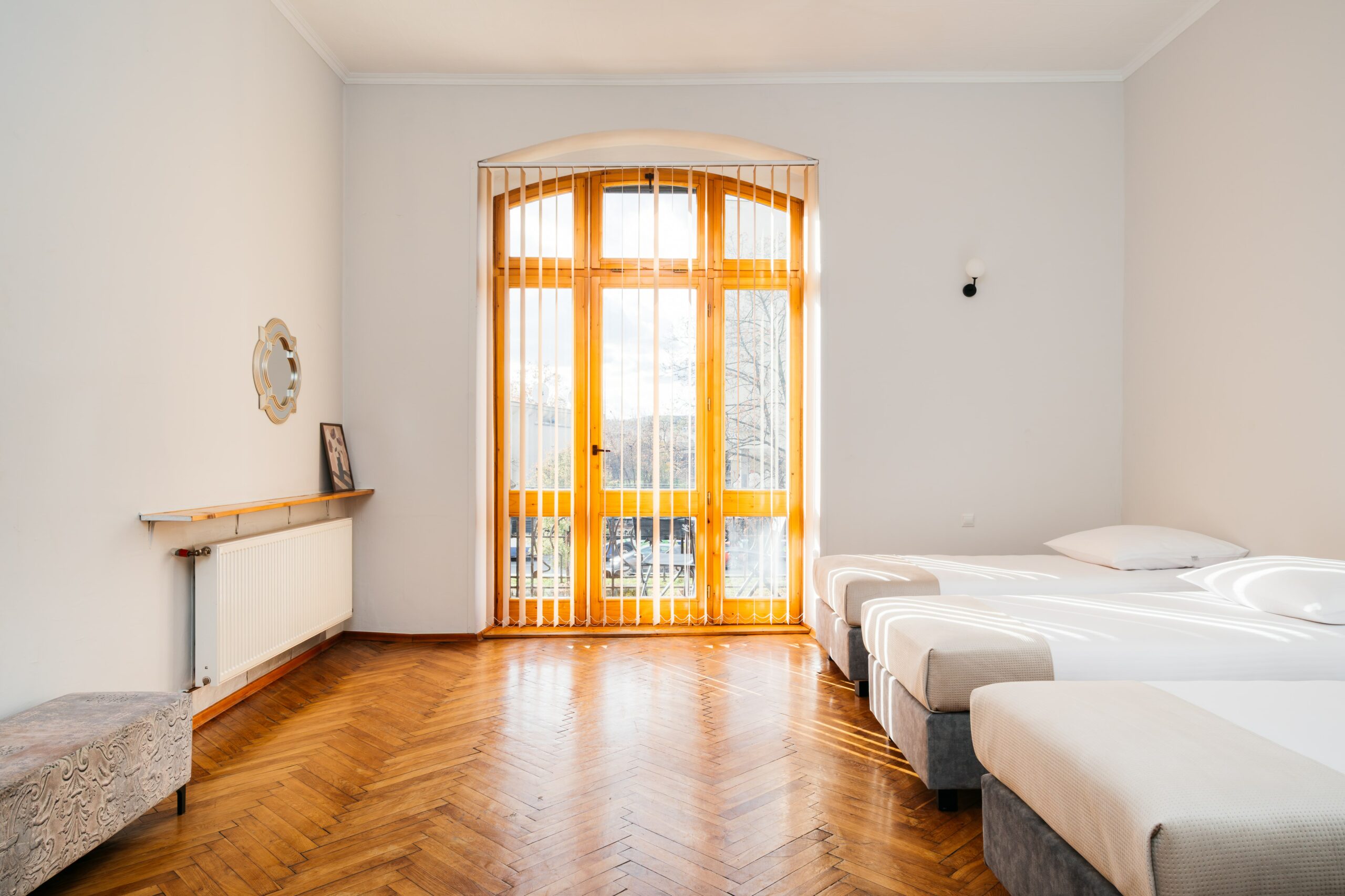 Wnętrze łączy klasyczne elementy z nutą nowoczesności – drewniane podłogi, wysokie sufity i duże okna nadają przestrzeni elegancki, krakowski charakter, a przy tym zachowują przytulny klimat sprzyjający odpoczynkowi po dniu zwiedzania.