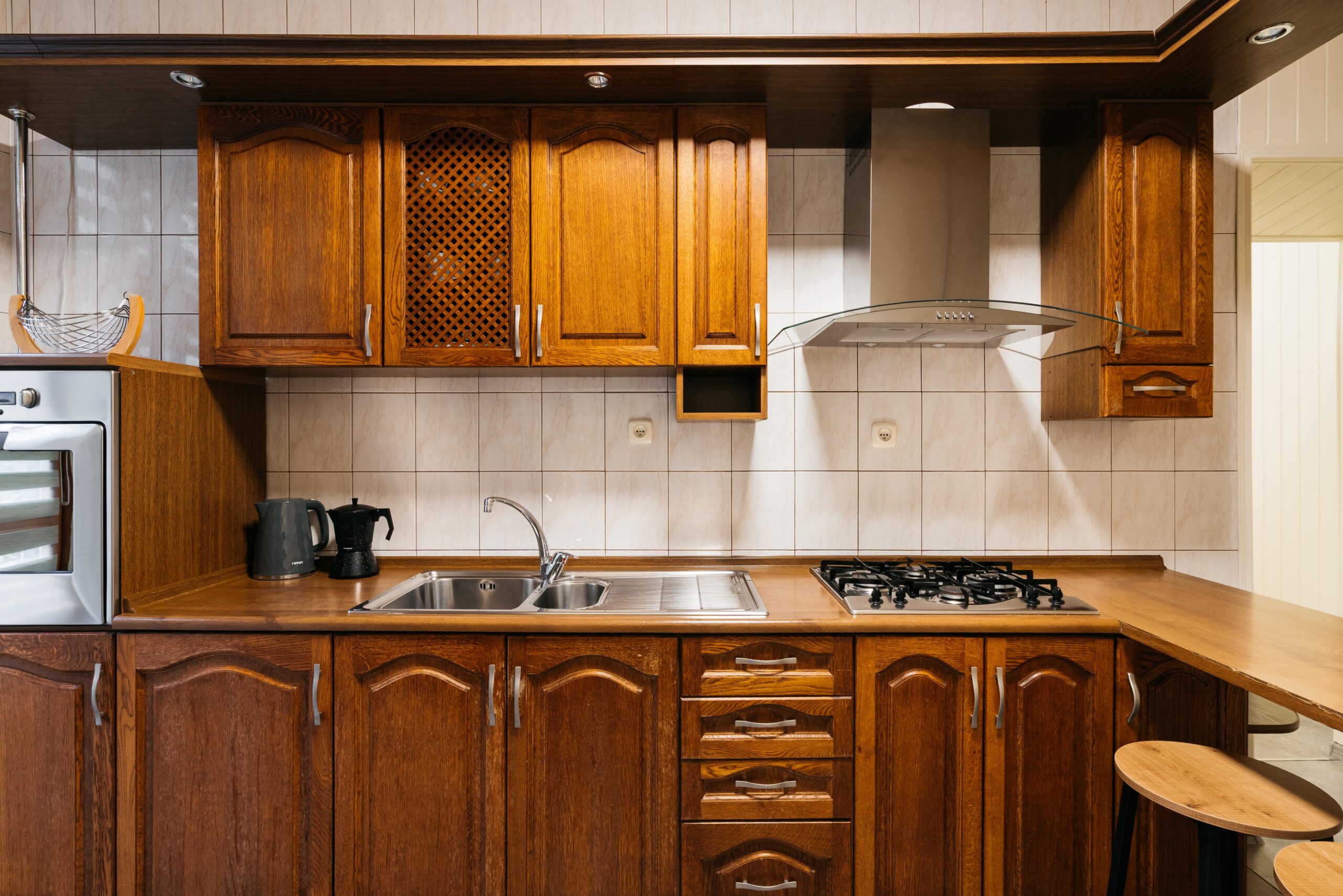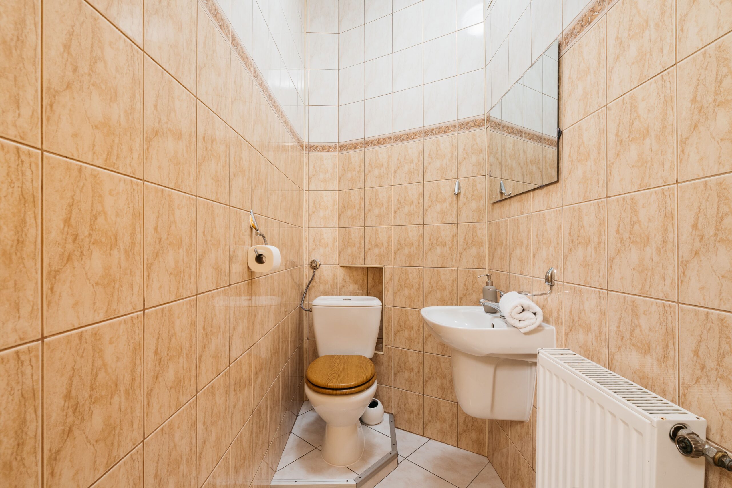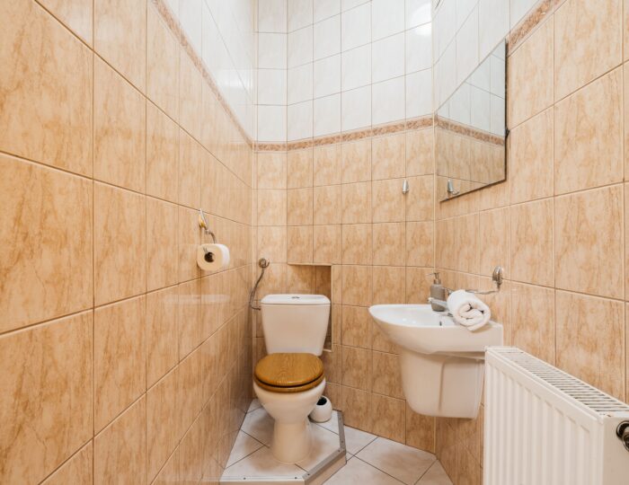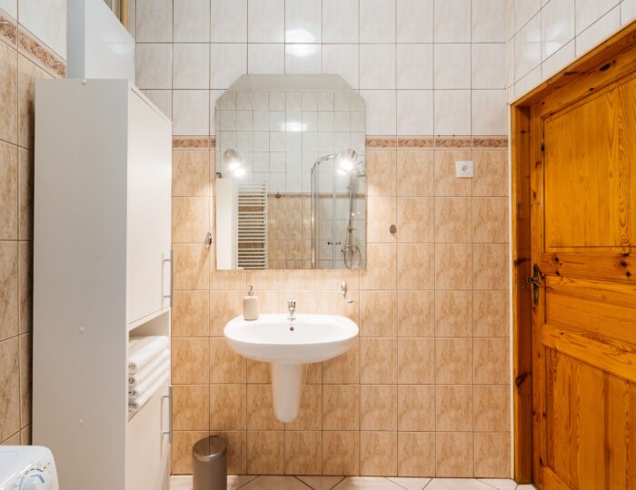 Kuchnia utrzymana w klasycznym stylu została w pełni wyposażona – znajduje się w niej m.in. piekarnik, czajnik, kawiarka oraz podstawowe akcesoria do gotowania i serwowania posiłków. Dodatkowym udogodnieniem jest oddzielna toaleta oraz łazienka z prysznicem i pralką, co znacząco podnosi komfort pobytu większej grupy.